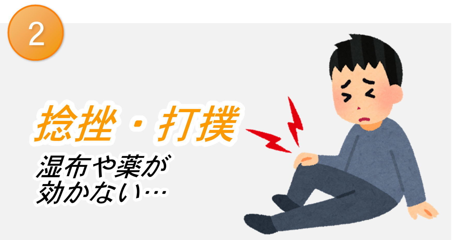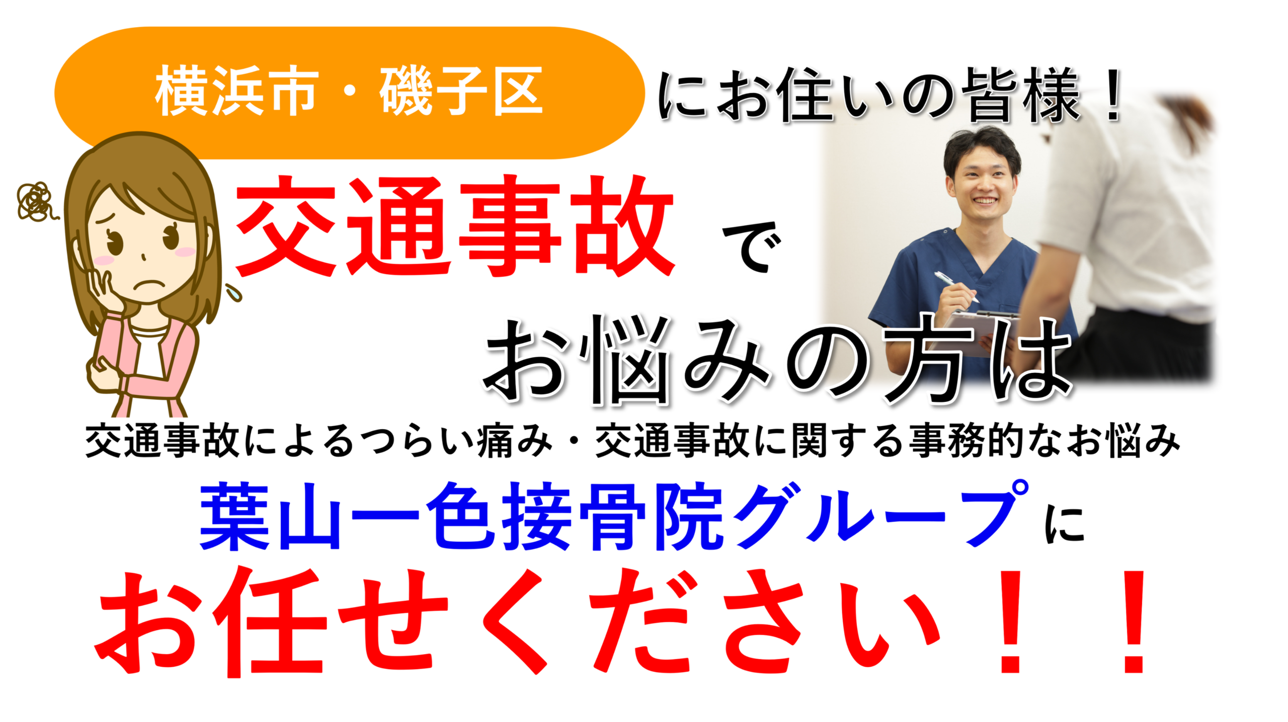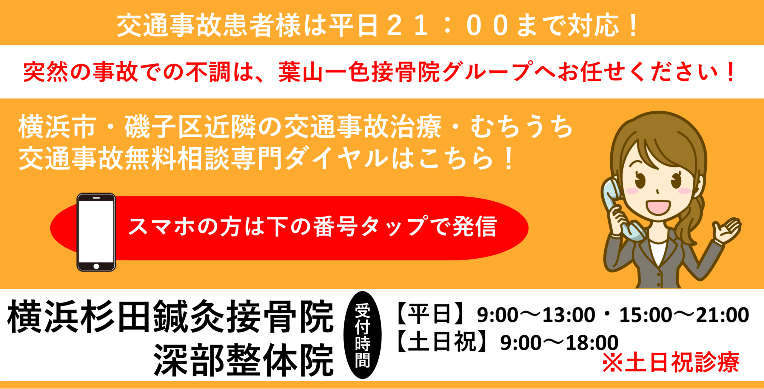 横浜杉田鍼灸接骨院は交通事故の怪我から来るむちうち治療、腰痛、しびれ、打撲などの様々な症状の治療を得意としております。