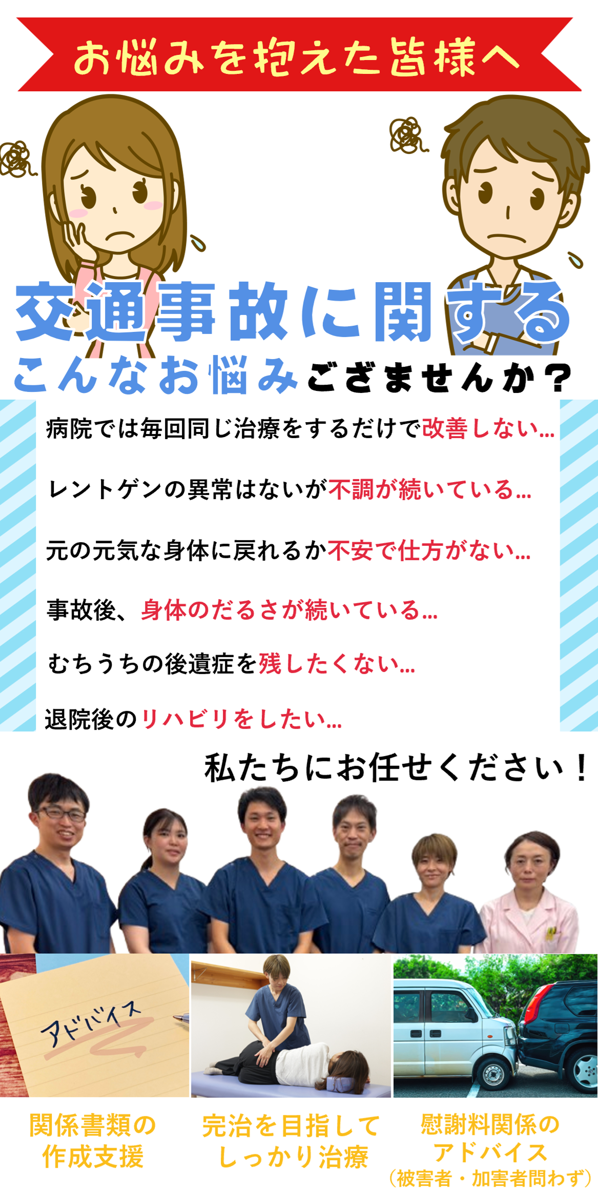 また、まだ病院や整形外科となどの医療機関を受診されていない場合はご紹介も行っておりますのでまずはご相談ください。 -