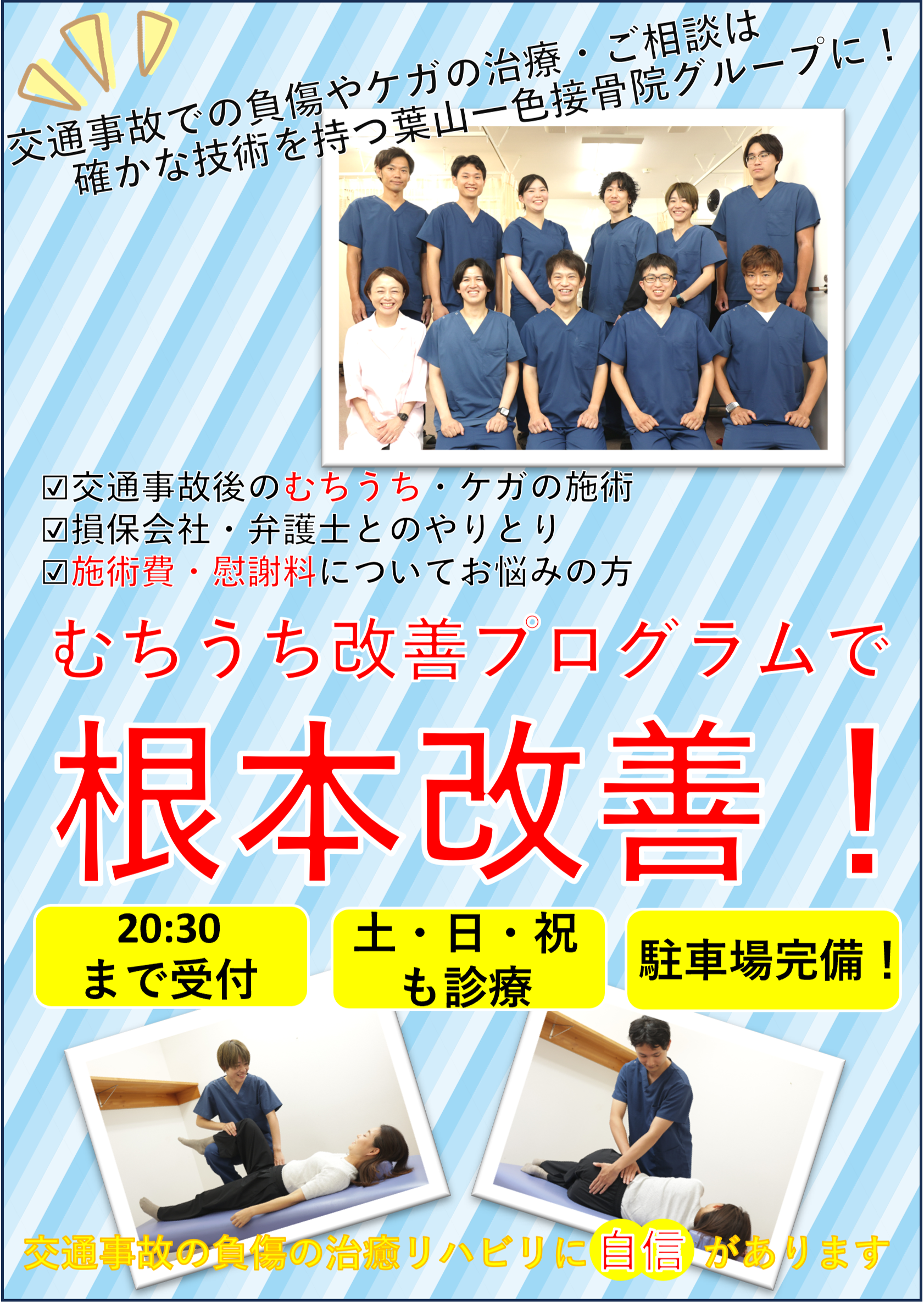 交通事故後、病院にてレントゲンやMRI等の画像診断が大切なのはもちろんですが、それ以上に大切なのは画像にて出血や骨折が無いことを確認してからのリハビリです。交通事故のムチウチに対して、首の牽引やウォーターベッドだけでは正直不十分なのです。