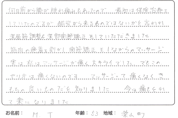何日前から膝が腫れ、痛みもあったので、最初は保険治療をしていたのですが、猫背からくるものではないかと言われ、深層筋調整&深部関節矯正をしていただきました。