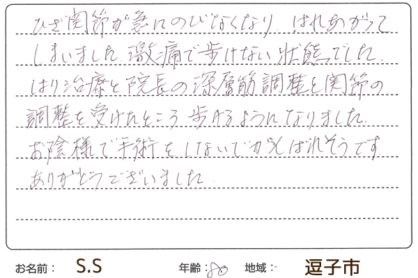 はり治療と院長の深層筋調整と関節の調整を受けたところ歩けるようになりました。