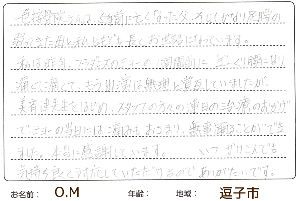 私は昨年、フラダンスのショーの一週間前にぎっくり腰になり、痛くて痛くて、もう出演は無理と覚悟していましたが、美斉津先生をはじめ、スタッフの方々の連日の治療のおかげで、ショーの当日には、痛みもおさまり、無事踊ることができました。