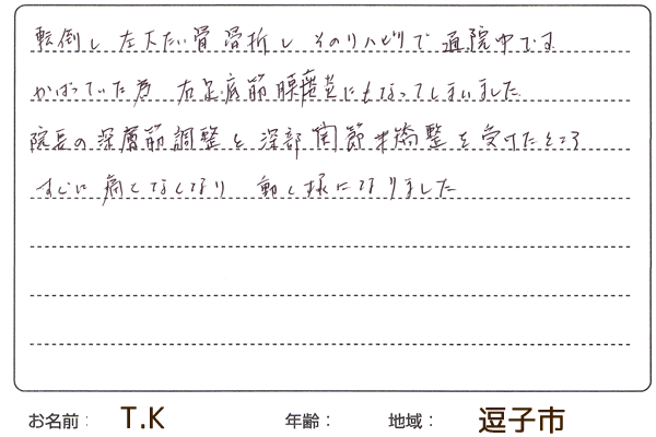 院長の深層筋調整と深部関節矯正を受けたところ、すぐに痛くなくなり、動く様になりました。